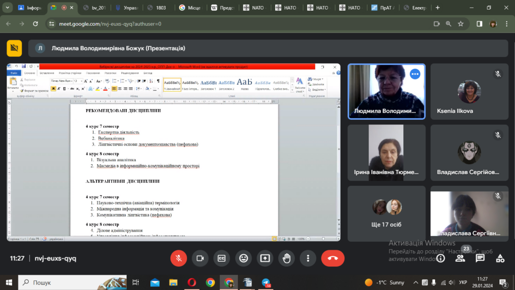 Здобувачі вищої освіти НАУ є повноцінними учасниками освітнього процесу, а, отже, вони мають право впливати на його організацію, одним із аспектів якої стають вибіркові дисципліни. Вибіркові дисципліни, які здобувачі вищої освіти обирають самостійно – це дисципліни, які вводяться для ефективного використання можливостей університету з метою якісного задоволення освітніх і кваліфікаційних потреб студентів, підвищення їх конкурентоспроможності та затребуваності на ринку праці. З 29 по 31 січня 2024 року на кафедрі історії та документознавства ФЛСК НАУ відбулися години корпоративної культури, зустрічі-обговорення науково-педагогічних працівників із здобувачами вищої освіти 1, 2, 3-х курсів ОС «Бакалавр» ОПП «Документознавство та інформаційна діяльність» та ОПП «Інформаційна аналітика та соціальні комунікації», присвячені питанням обрання навчальних дисциплін за вибором. Так, 29 січня 2024 р. на годині корпоративної культури наставником ДК 221 доцентом Халецькою Л.П. проведено інформування студентів групи ОПП «Документознавство та інформаційна діяльність» про порядок формування індивідуальної освітньої траєкторії здобувача вищої освіти НАУ. Студенти були ознайомлені з переліком вибіркових рекомендованих і альтернативних освітніх компонентів, отримали можливість ознайомитися з силабусами дисциплін на сайті ФЛСК НАУ. 30 січня 2024 р. завідувачка кафедри професор Тюрменко І.І., гарант ОПП «Документознавство та інформаційна діяльність» доцент Божук Л.В., наставник ДК 321 старший викладач Ількова О.Г. обговорили зі студентами академічної групи актуальні питання переваги вибору дисциплін, ознайомили їх з переліком дисциплін вільного вибору, який включає в себе як дисципліни випускової кафедри, так і дисципліни інших кафедр університету. Гарант ОПП «Документознавство та інформаційна діяльність» доцент Божук Л.В. під час зустрічі зі студентами ДК 121, які вперше обиратимуть вибіркові навчальні дисципліни на наступний навчальний рік, познайомила їх з «Положенням про формування індивідуальної освітньої траекторії здобувача вищої освіти в Національному авіаційному університеті» та «Покроковою інструкцією для здобувача вищої освіти в АС ФІОТ». 31 січня 2024 р. гаранти ОПП: «Інформаційна аналітика та соціальні комунікації», доцент Чепуренко Я.О. та «Документознавство та інформаційна діяльність», доцент Божук Л.В. провели відповідну інформаційну зустріч-обговорення дисциплін вільного вибору зі студентами  ДК 322 освітньо-професійної програми ««Інформаційна аналітика та соціальні комунікації». До відома усіх  студентів спеціальності було доведено графік проведення вибору дисциплін на 2024-2025 н.р. на сайті НАУ у рубриці «Здобувачу вищої освіти», підрубриці «Індивідуальна освітня траєкторія» з 07 лютого по 09 лютого 2024 р.