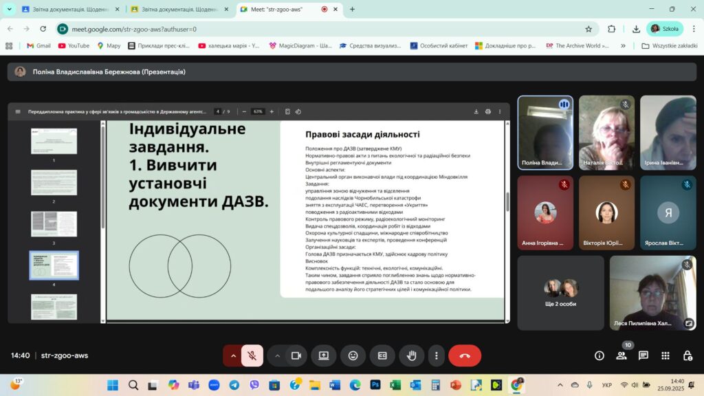 З 01 по 28 вересня 2025 р. тривала переддипломна практика магістрантів групи М-029-24-1 ДК спеціальності «Інформаційна, бібліотечна та архівна справа» ОПП «Документознавство та інформаційна діяльність», на якій студенти збирали матеріал для виконання кваліфікаційних робіт. Керівниками практики від Державного університету «КАІ» призначено доктора історичних наук, професора Ірину ТЮРМЕНКО, кандидатів історичних наук, доцентів кафедри Лесю ХАЛЕЦЬКУ та Наталію БЕМ. На початку практики керівниками практики від КАІ була проведена настановча конференція, інструктаж з техніки безпеки та видані індивідуальні завдання. Магістранти проходили практику в таких установах та організаціях: Державне агентство України з управління зоною відчуження (Поліна БЕРЕЖНОВА), Опорний заклад «Колківський ліцей» (Аріана ВАСЮХНИК), Товариство з обмеженою відповідальністю «Конструкторське бюро «Берил» (Анна ІВАНИЦЬКА), Товариство з обмеженою відповідальністю «Інститут Агробіології» (Вікторія КАСЯНЕНКО), Товариство з обмеженою відповідальністю «Бюро інвестиційних проектів проектний менеджмент» (Антон МЕЛЬНИЧЕНКО), Фінансове управління Богуславської міської ради (Аліна ПЕДЧЕНКО), Фізична особа-підприємець Якубчак Я.В (Ярослав ЯКУБЧАК). Результати практики засвідчили, що магістранти не лише вирішували виробничі завдання, а й зібрали необхідний матеріал для написання кваліфікаційних робіт. Керівники від баз практики в установах та організаціях високо оцінили підготовку магістрантів. Захист практики у формі презентацій відбувся 25.10.2025.