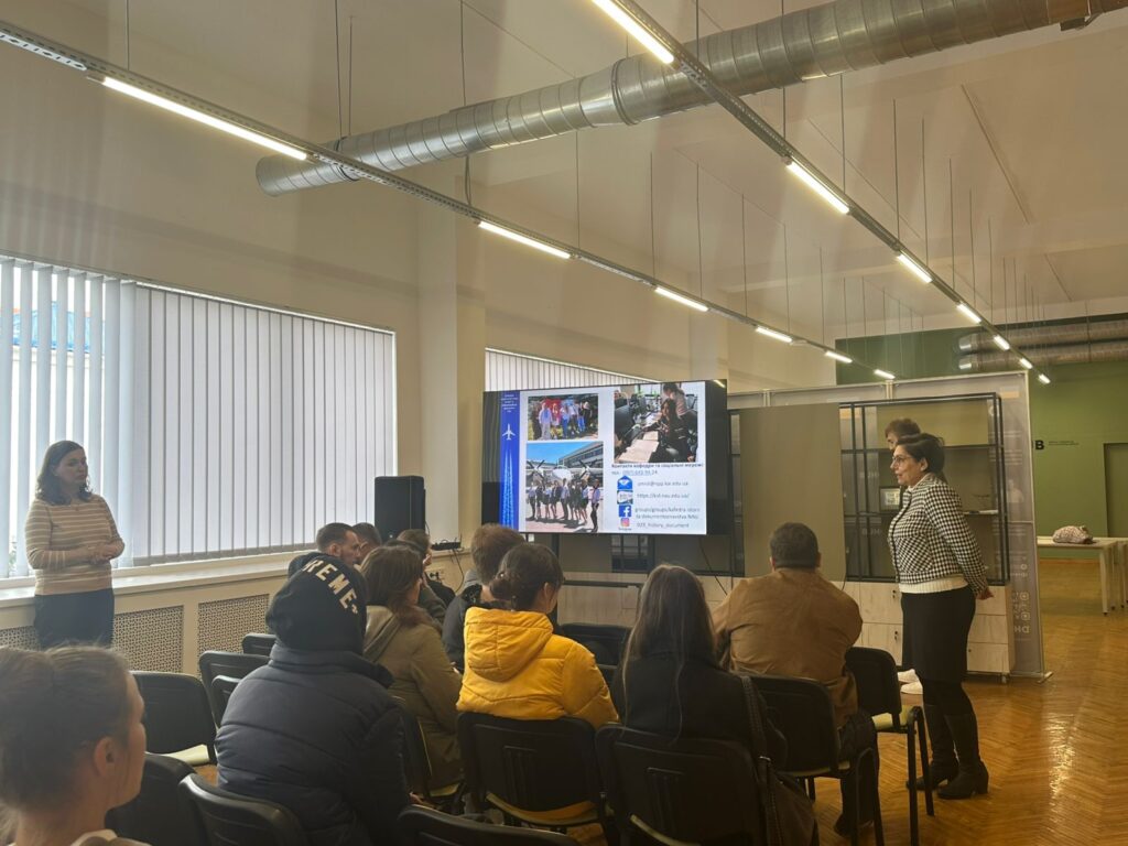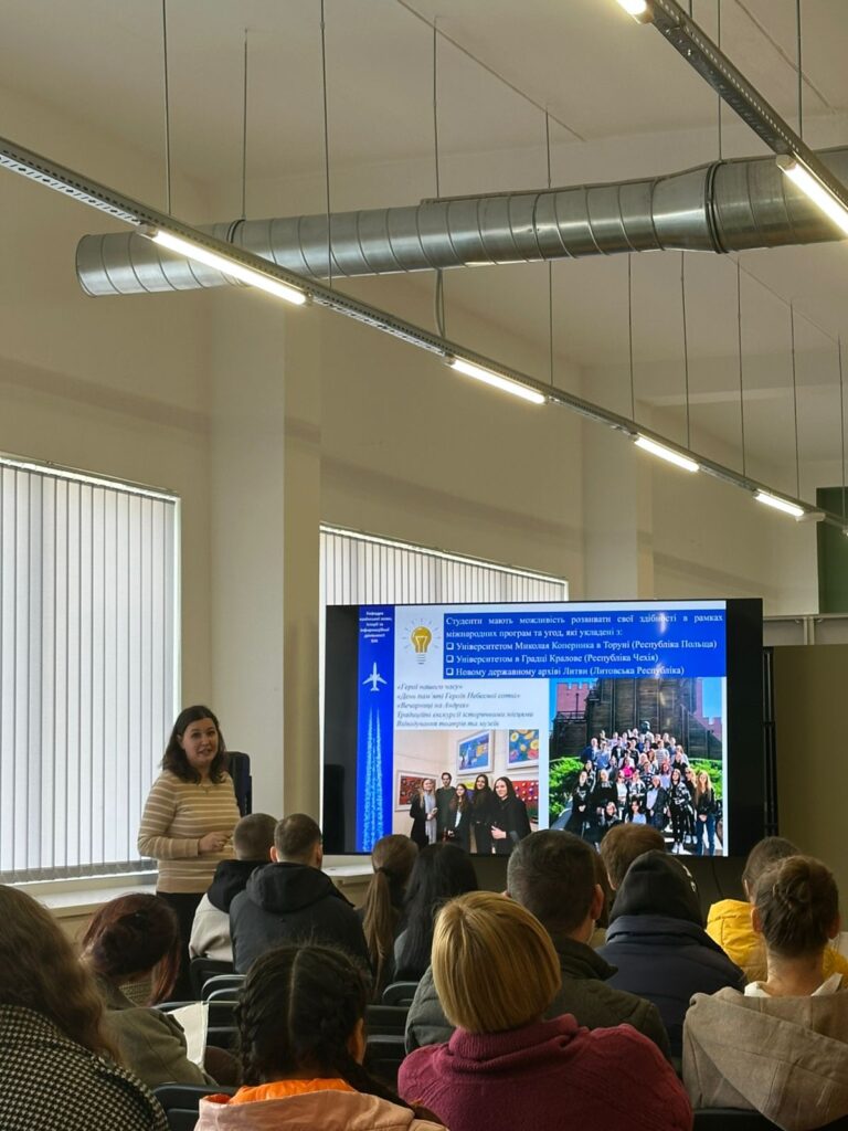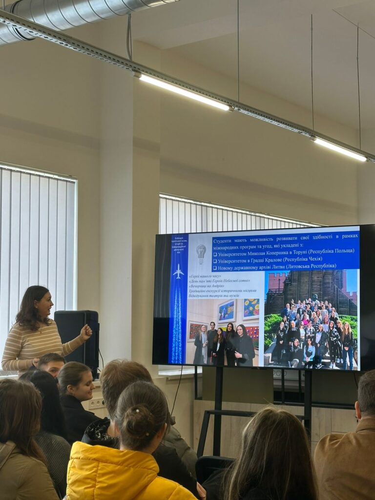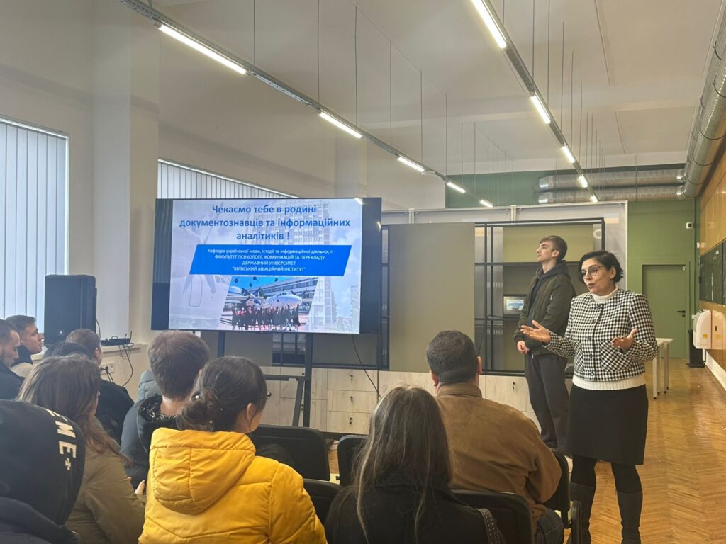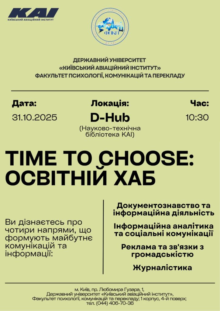 31 жовтня 2025 року в просторі D-Hub (науково-технічна бібліотека КАІ) відбувся профорієнтаційний захід «Time to choose: Освітній хаб», організований Факультетом психології, комунікацій та перекладу Державного університету «Київський авіаційний інститут». Учасниками події стали студенти Фахового коледжу інженерії, управління та землевпорядкування КАІ, які навчаються за спеціальностями «Журналістика» та «Діловодство». З вітальним словом до присутніх звернулася в.о. декана факультету психології, комунікацій та перекладу Наталія Мельник, яка наголосила на важливості усвідомленого професійного вибору та розвитку сучасних комунікаційних компетентностей.