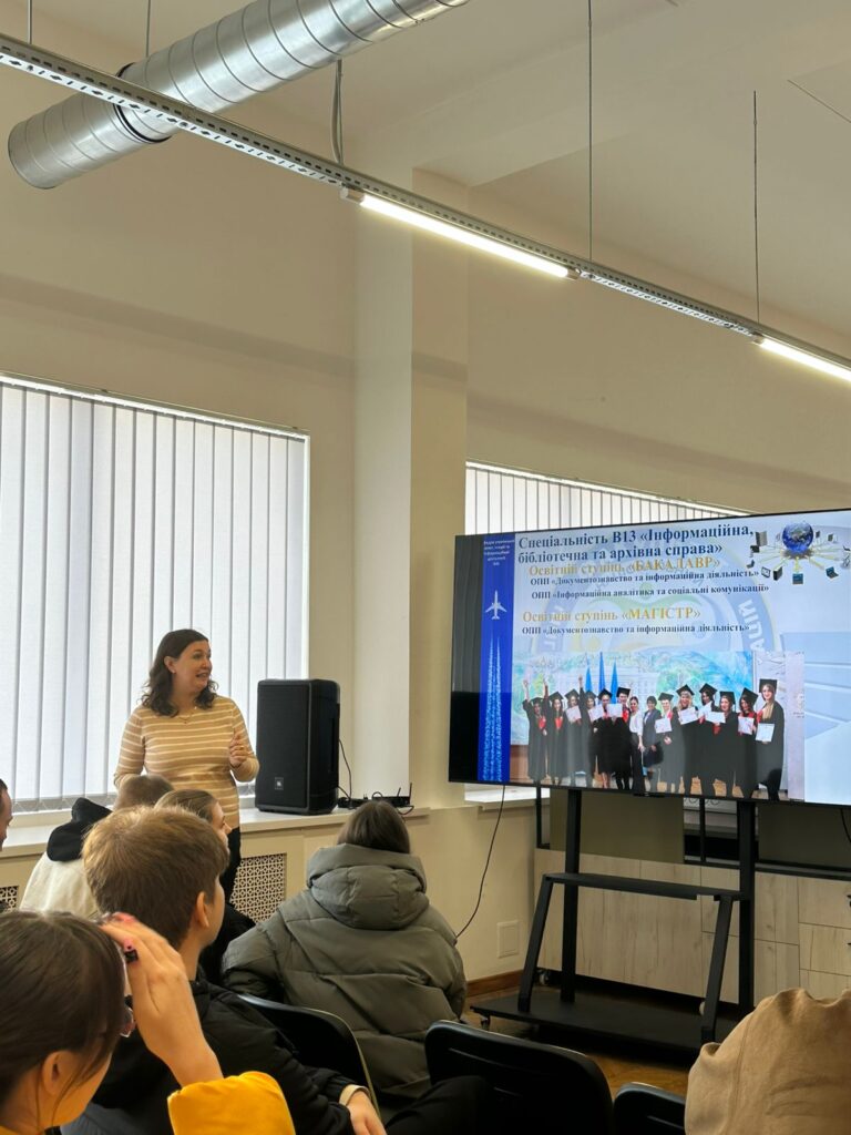 Про особливості освітніх програм факультету розповіли викладачі КАІ: Анастасія Сібрук, Ірина Тюрменко, Володимир Бірюков, В’ячеслав Васильченко та Антоніна Іващук. Вони ознайомили учасників із напрямами підготовки, що формують майбутнє комунікацій та інформації: «Документознавство та інформаційна діяльність», «Інформаційна аналітика та соціальні комунікації», «Реклама та зв’язки з громадськістю», «Журналістика».