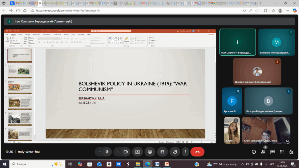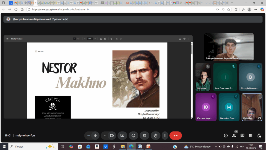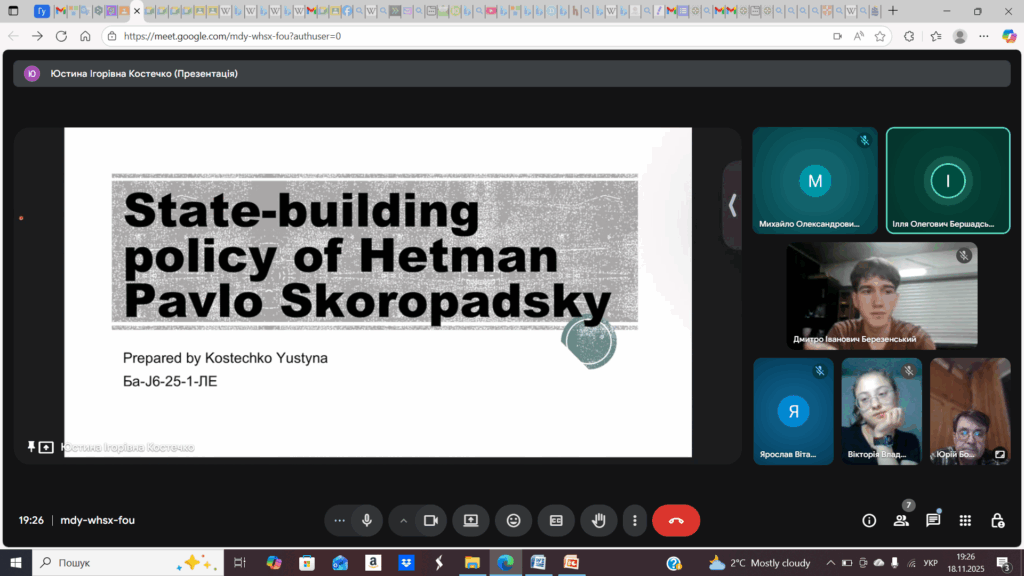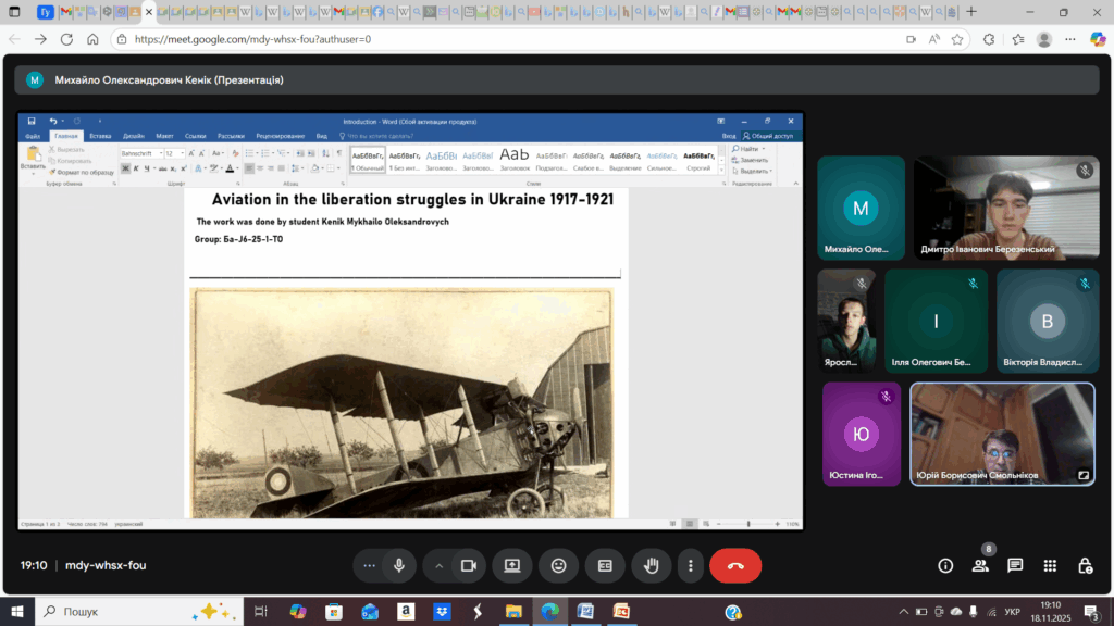 18 листопада 2025 відбулося засідання англомовного історичного гуртка “Topical Problems of Ukrainian History” («Актуальні проблеми історії України») присвячене 108-й річниці Української революції і визвольним змаганням 1917-1921 років. Засідання провів керівник гуртка кандидат історичних наук, доцент кафедри української мови, історії та інформаційної діяльності Юрій Смольніков. Участь у засіданні гуртка взяли студенти груп Ба –J6 – 25 – 1 ЛЕ та Ба- J6 – 25 – 1 TO англомовного проєкту ДУ КАІ.
