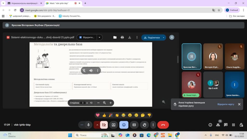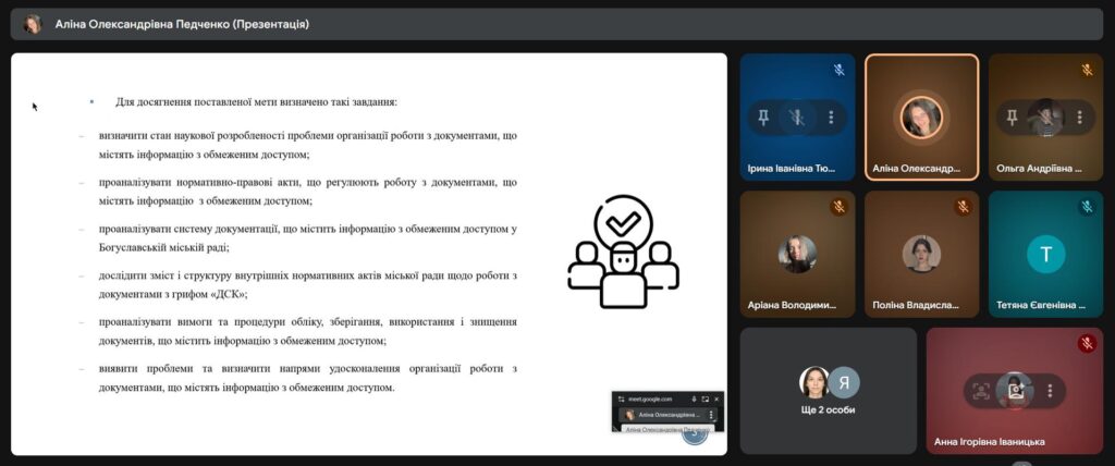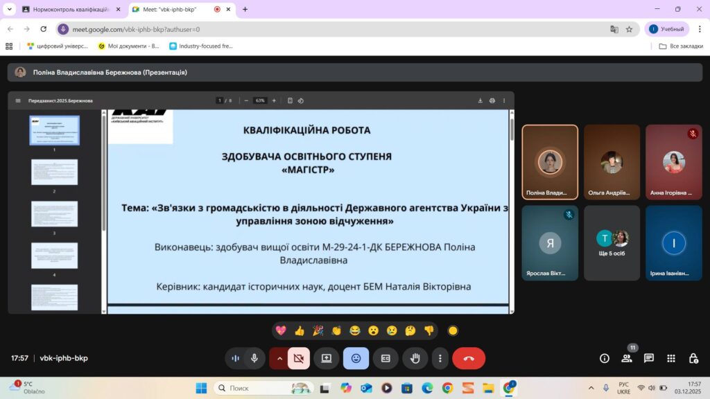 03 грудня 2025 р. відбувся передзахист магістерських кваліфікаційних робіт здобувачів групи М-В13-2024-1-ДК. Комісія у складі док. іст. наук, професора Ірини ТЮРМЕНКО, канд. іст. наук, доцентів кафедри української мови, історії та інформаційної діяльності Тетяни КУРЧЕНКО, Лесі ХАЛЕЦЬКОЇ, Ольги ЮРЧЕНКО засвідчили високий рівень компетентностей студентів, вміння аргументовано відповідати на запитання членів комісії, розуміння предмету та об’єкту магістерського дослідження. До захисту були рекомендовані кваліфікаційні роботи Поліни БЕРЕЖНОВОЇ, Аріани ВАСЮХНИК, Анни ІВАНИЦЬКОЇ, Вікторії КАСЯНЕНКО, Аліни ПЕДЧЕНКО, Ярослава ЯКУБЧАКА.