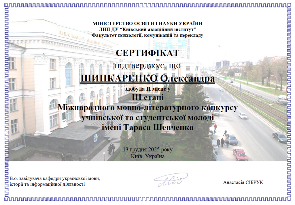 За результатами ІІІ етапу ХVІ Міжнародного мовно-літературного конкурсу учнівської та студентської молоді імені Тараса Шевченка, що відбувся 13 грудня 2025 року, до складу переможців (ІІ місце), які продовжать боротьбу за перемогу у фінальному етапі конкурсу, увійшла студентка-третьокурсниця факультету психології, комунікацій та перекладу Олександра Шинкаренко, яку підготувала в.о. завідувача кафедри української мови, історії та інформаційної діяльності Анастасія Сібрук.