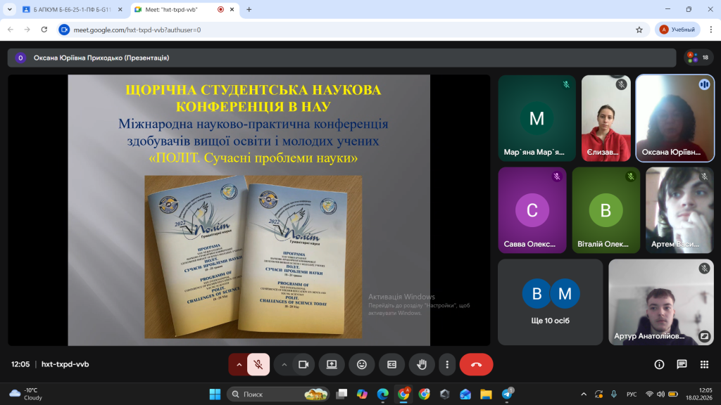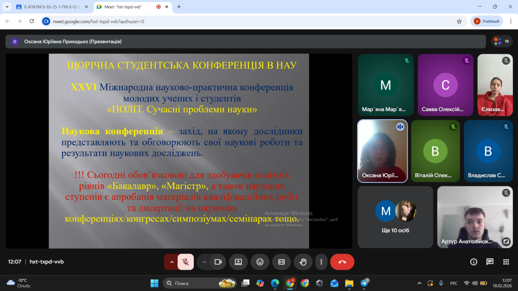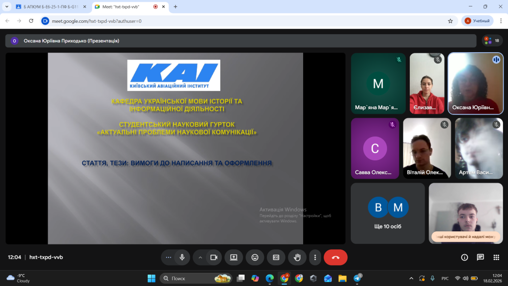 25 лютого 2025 року в рамках роботи студентського наукового гуртка «Актуальні проблеми наукової комунікації» (керівники – доцент Оксана Приходько та доцент Ганна Онуфрійчук), що функціонує на кафедрі української мови, історії та інформаційної діяльності, було проведено засідання за темою «Стаття, тези: вимоги до написання та оформлення». Засідання було приурочено підготовці друкованих матеріалів у науковому збірнику тез до ХХVІ Міжнародної науково-практичної конференції молодих учених і здобувачів вищої освіти «ПОЛІТ. Сучасні проблеми науки».