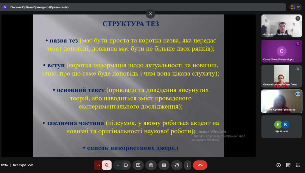 Здобувачі вищої освіти нашого університету, які взяли участь у засіданні, мали змогу ознайомитися зі структурою тез, технічними вимогами до їх написання та оформлення, а також обговорити актуальні проблеми сучасної науки та сьогодення, які можуть бути покладені в основу їх наукових розвідок.
