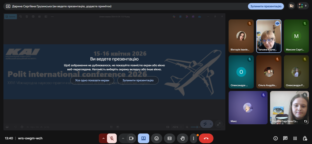 15 квітня 2026 року на кафедрі української мови, історії та інформаційної діяльності ГМФ відбулось  засідання секції «Документно-інформаційні комунікації в глобалізованому світі». Робота секції проходила  в рамках проведeння  XVI Міжнародної науково-практичної конференції «Політ. Cучасні проблеми науки», що багато років відкриває наукову дорогу сотням молодих науковців, дає життя десяткам стартапів. Робота секції проходила у змішаному режимі. ЇЇ модераторами виступили кандидатки історичних наук, доцентки Наталія БЕМ та Тетяна КУРЧЕНКО.
